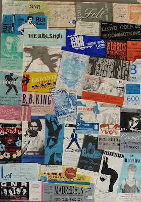 Assim, entre Dezembro de 1986 e Novembro de 1990, período a que se refere este conjunto inicial, estivemos em quase quarenta concertos, uma boa média por alto de 12 espectáculos por ano. Proliferam os GNR (5 concertos), referente ao primeiro bilhete (Carlos Alberto, Dezembro de 1986) e há até um deles que diz respeito ao espectáculo da banda no pavilhão da escola secundária de Rio Tinto, a 100 metros de casa. É que nesses tempos eles eram, sem dúvida, apetecíveis. Depois há Rui Veloso e o concerto do Coliseu que deu direito até a disco ao vivo, os Trovante, os Heróis do Mar na primeira parte dos Blow Monkeys numa memorável noite de queima coimbrã, concerto gravado em cassete a partir dum Sony emprestado. Eram tempos de os Madredeus começarem a dar cartas e por aqui anda o pequeno bilhete da estreia mundial da banda, também no Carlos Alberto, na primeira parte dos Sétima Legião (20 Novembro de 1987) e que em três anos esgotavam o Coliseu do Porto (4 Maio 1990). Há também os Woodentops e os Lords Of New Church na mesma noite em sítios diferentes, os Pogues nas Antas e uma rábula à volta do brinco (anel?) perdido em palco pelo Shane MacGown, o Kid Creole e as suas Coconuts no Coliseu com direito a projecção do filme "La Bamba" (shhhh), uma ida e vinda de camioneta à última hora via Terra Nova só para não perder estreia dos Cure em Portugal (20 Junho 1989), o Bowie em Alvalade mas que era para ser no Restelo, o Peter Murphy no Rivoli com o palco a ceder e o artista a compensar os danos cantando para a rua lateral a partir da janela (é verdade), os Go Betweens e o bilhete assinado numa história mirabolante e inesquecível, os The The nas Antas e o primeiro dos Smiths (Johnny Marr) a pisar solo português, os Jesus & Mary Chain às escuras no Infante Sagres, os Sisters of Mercy no Coliseu à pinha e trajado de preto, o Loyd Cole em ascensão meteórica, os 10 000 Maniacs, Bolshoi ou Felt de que já não nos lembrávamos, o Dorutti Column na Indústria cheia de gente conhecida (Reininho, Pragal, etc.), o saudoso BB King coadjuvado pelo Veloso, os Vaya Con Dios no Infante Sagres e a imensa surpresa da primeira parte: Andy White, um irlandês que rodava muito pelo "Som da Frente" e que era um dos nossos heróis de então e com quem estivemos à conversa no bar quase o espectáculo todo dos belgas. Já chega. Ah, é verdade, vimos mesmo os Mission duas vezes em pouco mais de um ano...