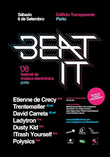 Ainda não começaram as férias mas já há um festival recomendado para a rentrée. Chama-se Beat It, vai decorrer no Edifício Transparente, junto ao Castelo do Queijo e ao mar e as ondas prometidas são de teor electrónico. Numa só noite, dia 6 de Setembro, teremos, entre outros, actuações ao vivo de Ladytron, !TrashYourself e o “clássico” Etienne de Crecy.